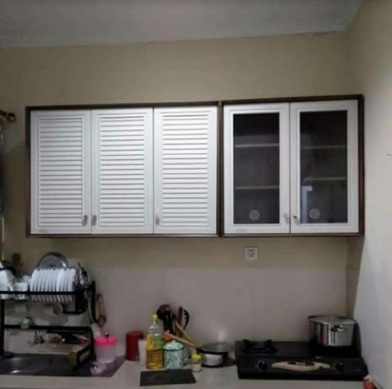 Lemari dapur gantung di atas terbuat dari material aluminium dan kaca sehingga tahan lama dan mudah dibersihkan. Selain itu material aluminium juga tidak mudah berkarat tahan api dan tidak memerlukan banyak perawatan. Apalagi kalau pilihan warna adalah warna kayu seluruh bagian dapur memiliki warna yang sama termasuk lemari gantung dapur.